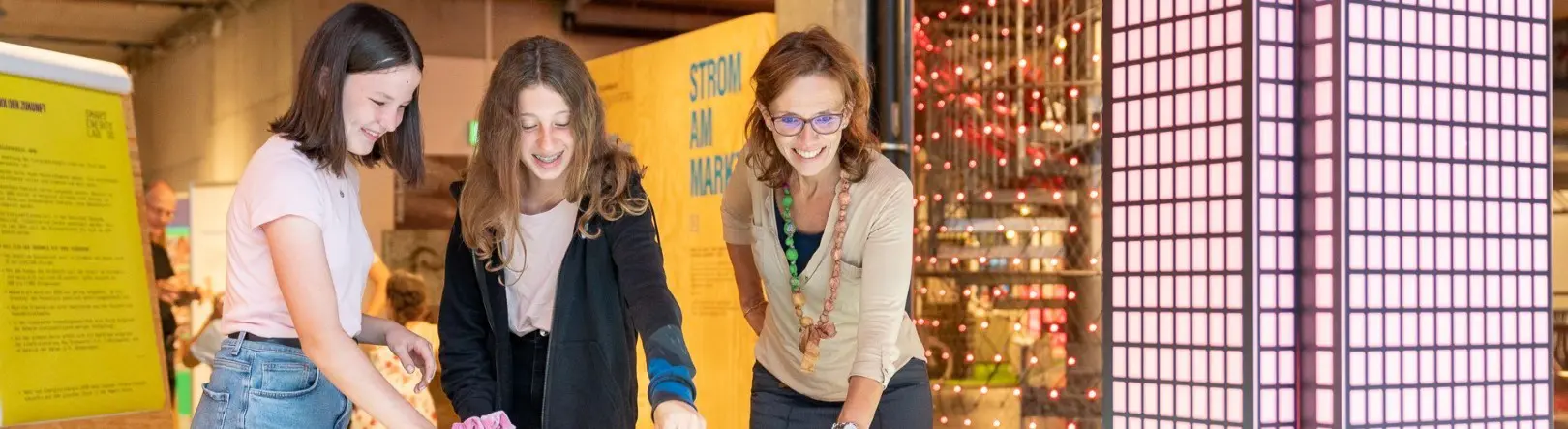 Auf dem Bild sind zwei Mädchen und eine Frau die lächelnd auf etwas hinabschauen.