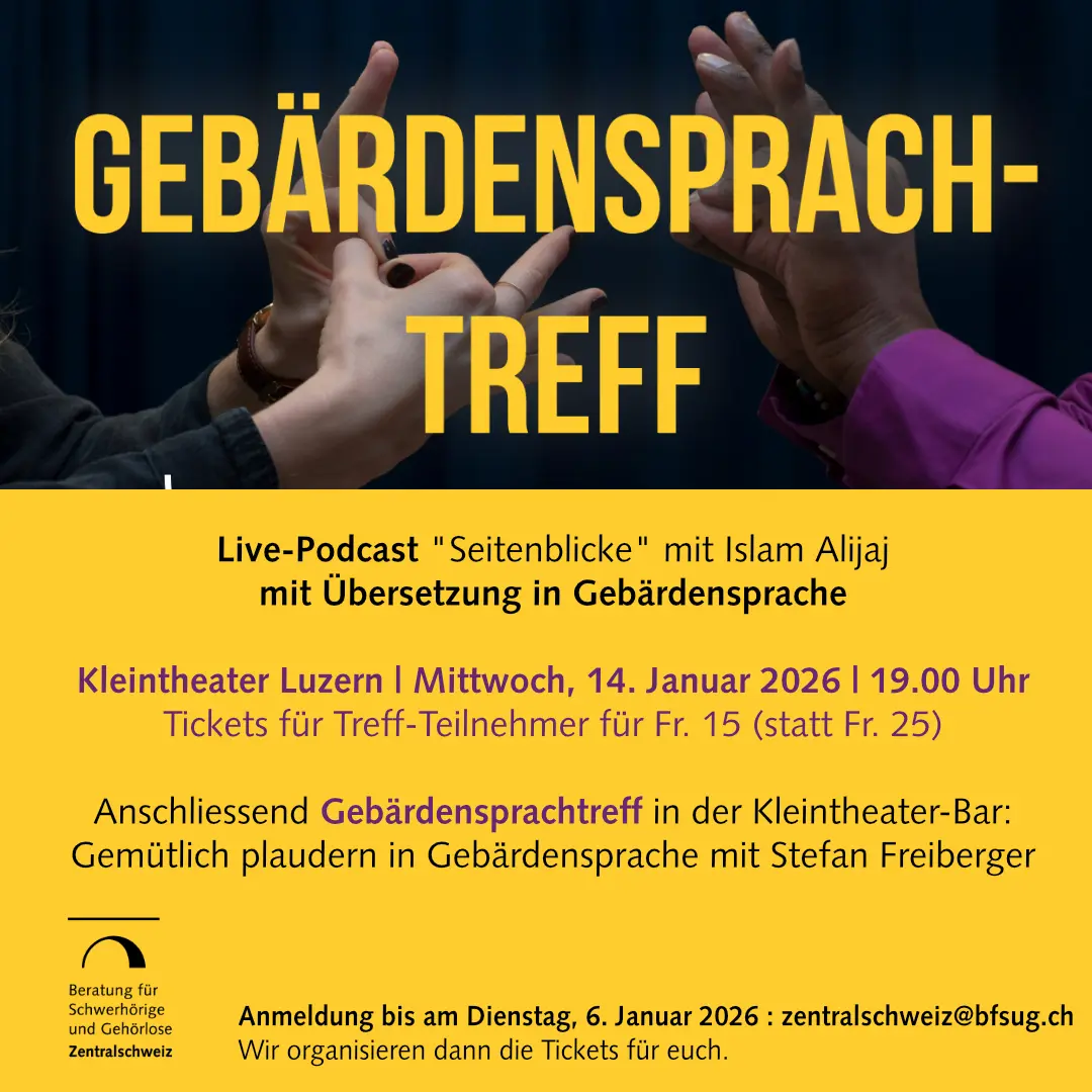 Der nächste Gebärdensprachtreff findet am Mittwoch, 14. Januar 2026, 19.00 Uhr im Kleintheater Luzern statt.